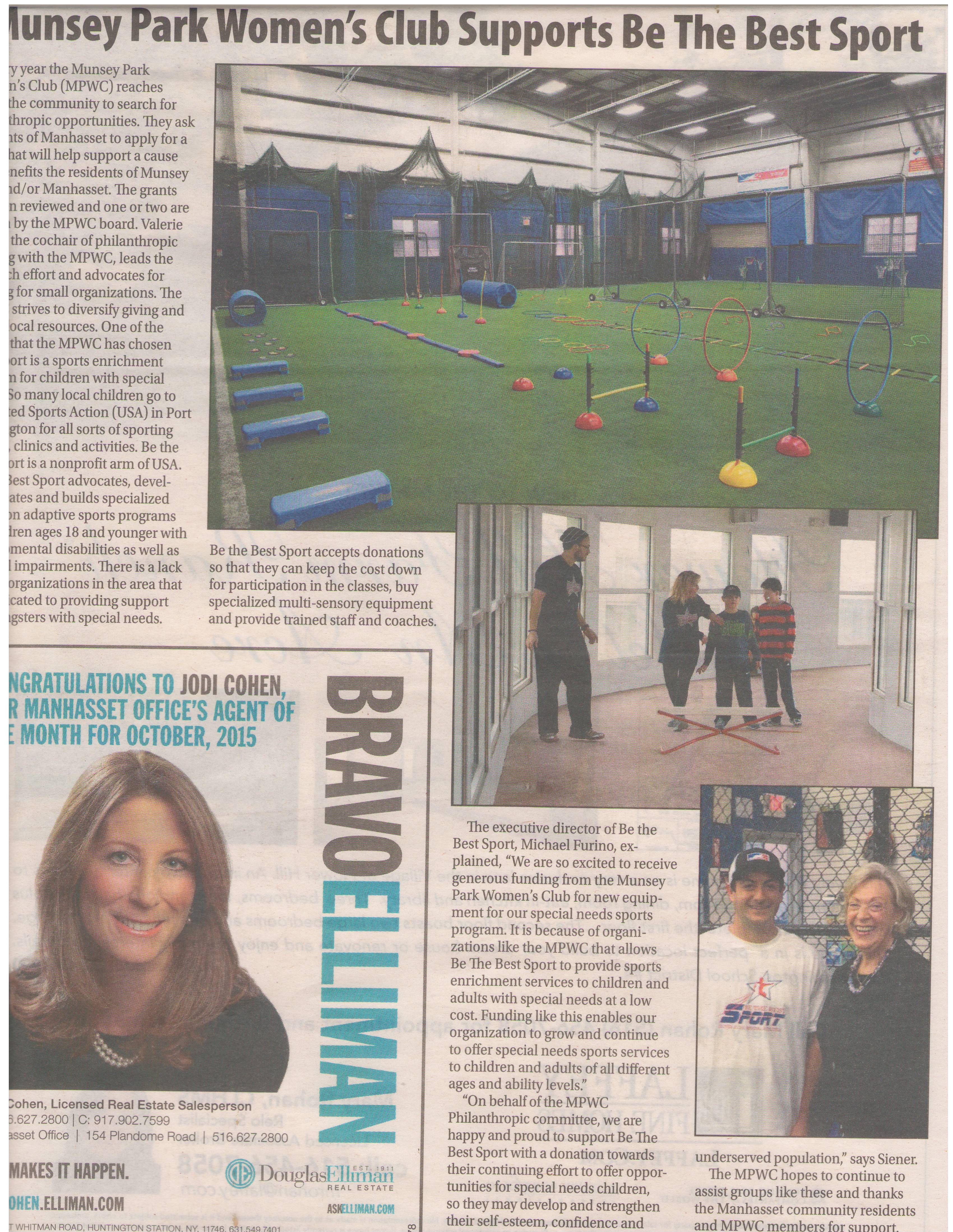 The Executive Director of Be The Best Sport, Michael Furino, explain, “We are so excited to receive generous funding from the Munsey Park Women’s Club for new equipment for our special needs sports program. It is because of organizations like the MPWC that allows Be The Best Sport to provide sports enrichment services to children and adults with special needs at a low cost. Funding like this enables our organization to grow and continue to offer special needs sports services to children and adults of all different ages and ability levels.”
